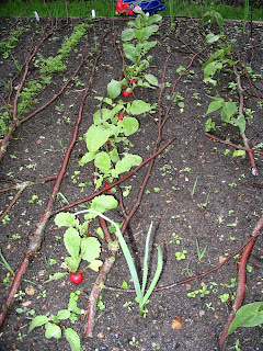 Radish was recommended for an easy, quick first crop, and I agree. Having sown a few seeds a few weeks ago in our new raised beds, we are already the proud nibblers of peppery radish, rocket leaves, and nasturtium flowers.