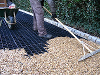 Granite setts were laid as edgers to contain the shingle, and to prevent migration onto the highway. To stabilise the shingle we installed a plastic grid, thus preventing rutting.