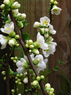 If you’re out looking for plants this weekend, you may notice the Chaenomeles blossoming. Its flowers look great on the leafless stems. This photo is of a pure white variety called ‘Nivalis’. Chaenomeles will even thrive on a sunless wall, and add early spring cheer to your garden. A beautiful plant, spiny and will produce the fruit quince.